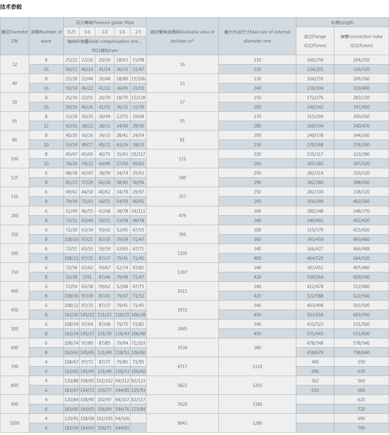通徑Diameter DN 波數Number of wave 壓力等級Pressure grade Mpa 波紋管有效面積Available area of bellows c㎡ 很大外徑尺寸Max size of external diameter mm 長度Length