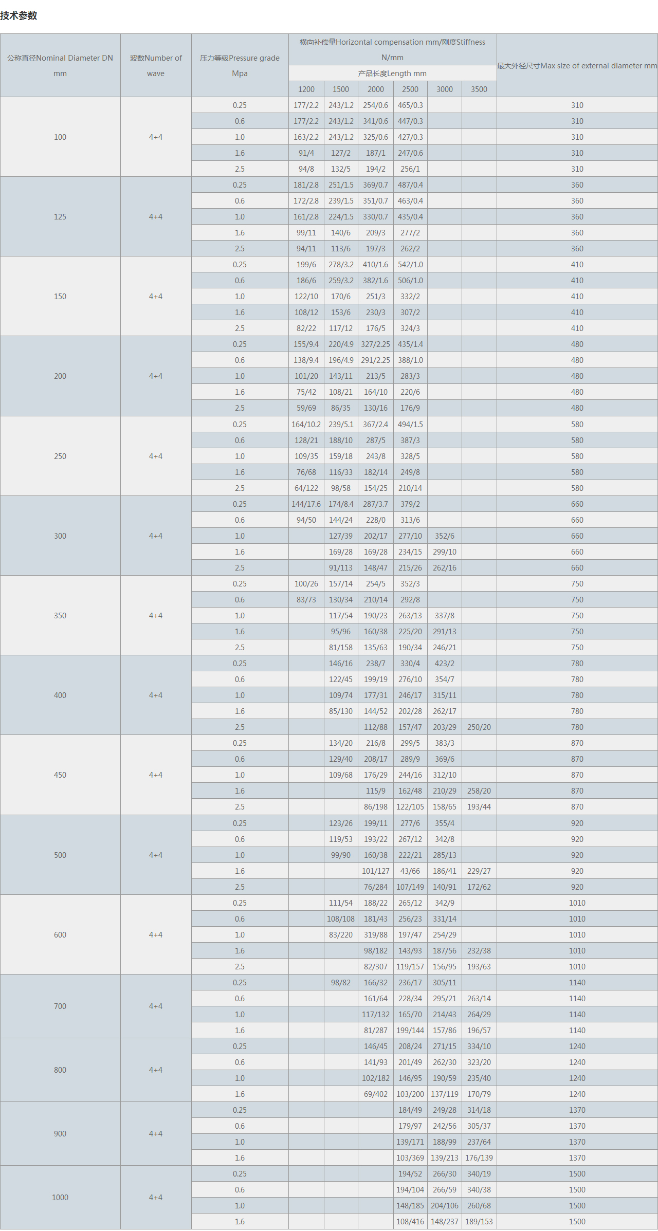 | 公稱直徑Nominal Diameter DN mm | 波數(shù)Number of wave | 壓力等級Pressure grade Mpa | 橫向補(bǔ)償量Horizontal compensation mm/剛度Stiffness N/mm | 很大外徑尺寸Max size of external diameter mm | |||||