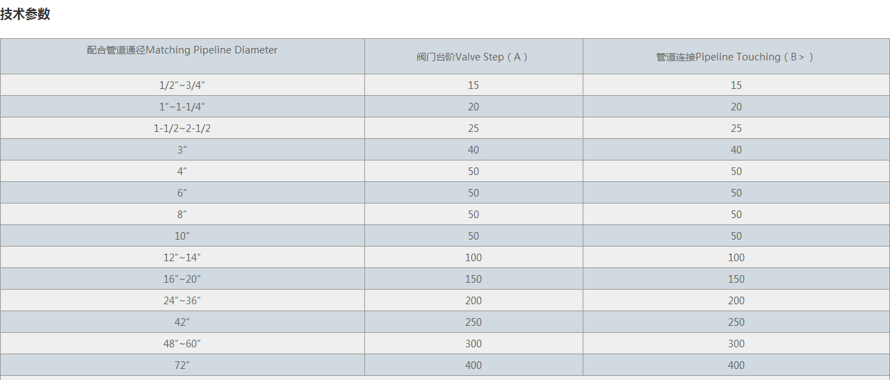 | 配合管道通徑Matching Pipeline Diameter | 閥門臺(tái)階Valve Step(A) | 管道連接Pipeline Touching(B>) |