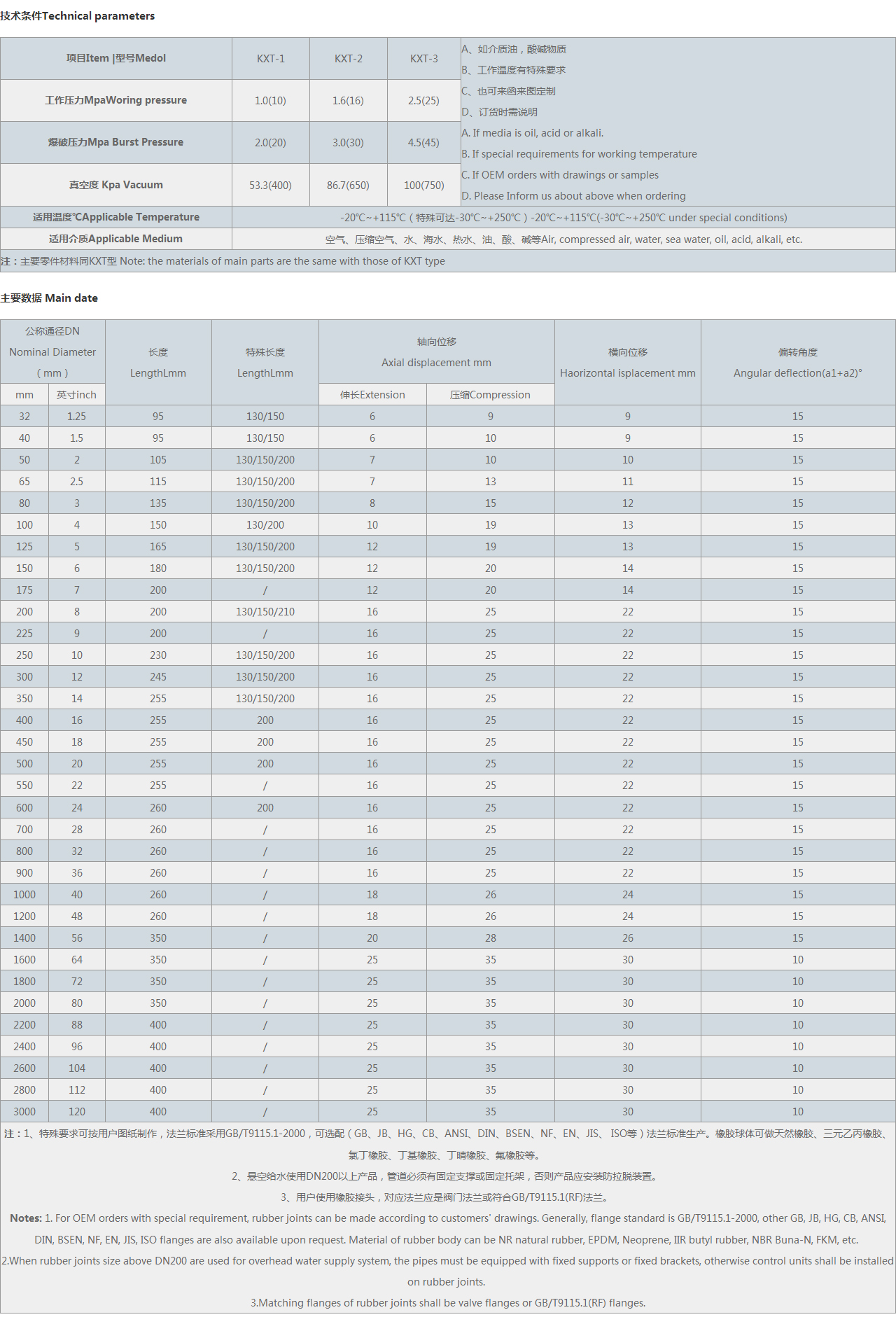 | 注:1、特殊要求可按用戶圖紙制作,可選配(GB、JB、HG、CB、ANSI、DIN、BSEN、NF、EN、JIS、 等)法蘭標準生產。橡膠球體可做天然橡膠、三元乙丙橡膠、氯丁橡膠、丁基橡膠、丁晴橡膠、氟橡膠等。 2、懸空給水使用DN200以上產品,管道必須有固定支撐或固定托架,否則產品應安裝防拉脫裝置。 3、用戶使用橡膠接頭,對應法蘭應是閥門法蘭。 Notes: 1. For OEM orders with special requirement, rubber joints can be made according to customers' drawings. Generally, flange standard is, other GB, JB, HG, CB, ANSI, DIN, BSEN, NF, EN, JIS, flanges are also available upon request. Material of rubber body can be NR natural rubber, EPDM, Neoprene, IIR butyl rubber, NBR Buna-N, FKM, etc. 2.When rubber joints size above DN200 are used for overhead water supply system, the pipes must be equipped with fixed supports or fixed brackets, otherwise control units shall be installed on rubber joints. 3.Matching flanges of rubber joints shall be valve flanges or flanges. |